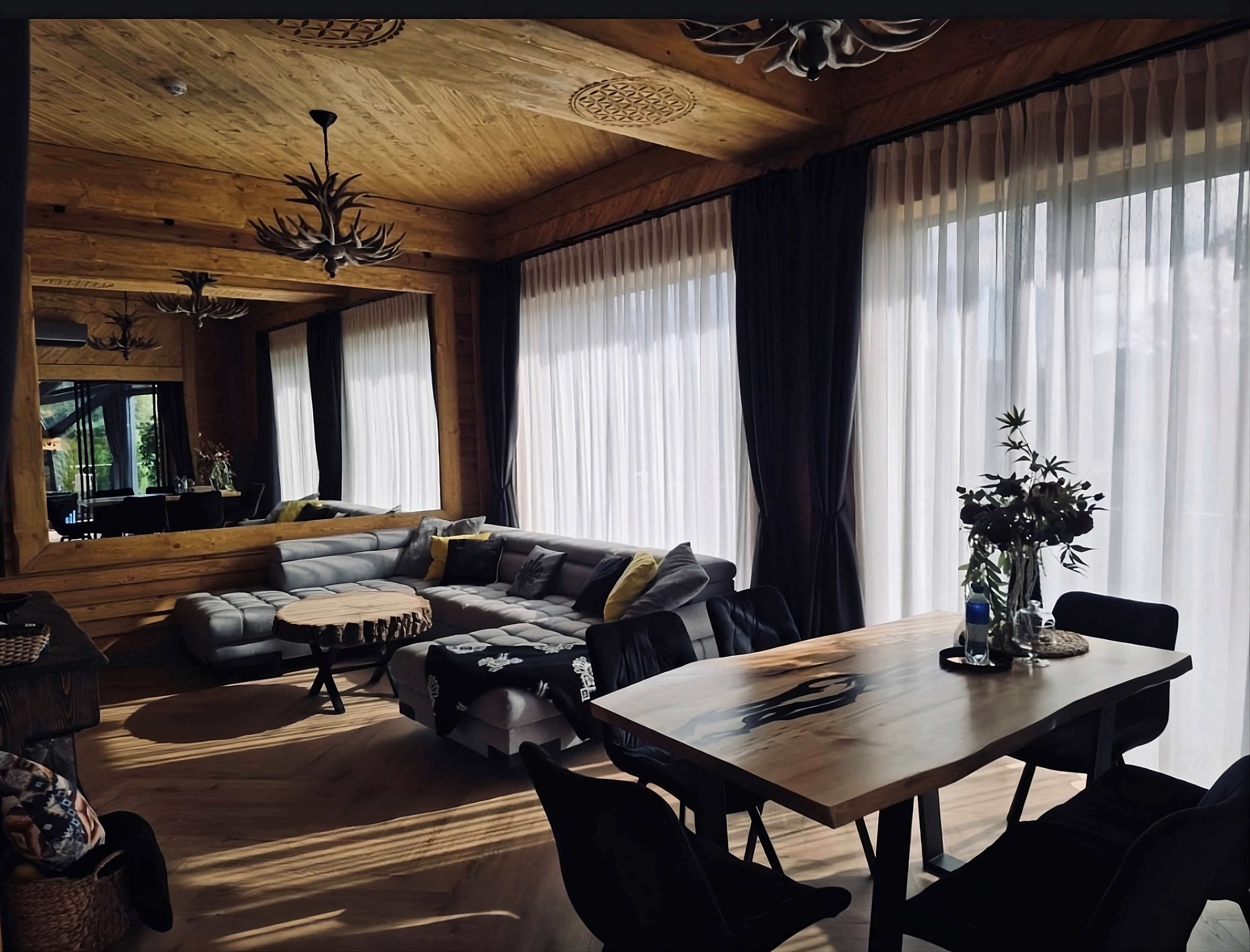 Wnętrza łączą naturalne materiały z nowoczesnym wyposażeniem. Jacuzzi na miejscu pozwala odpocząć po nartach lub trekkingu.